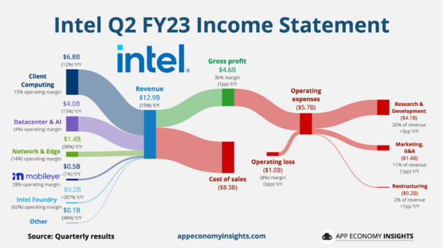 拆分业务来看,二季度英特尔客户计算业务营收下滑12%至67.8亿美元,高于市场预期的61.0亿美元;数据中心及人工智能业务营收下降15%至40亿美元,高于市场预期的38.2亿美元;网络及创新业务营收大降38%至14亿美元;MobilEye业务营收小幅下降1%至4.54亿美元;英特尔Foundry服务业务同比大增307%至2.32亿美元。