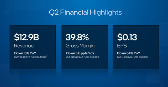 7月27日周四,英特尔公布二季度业绩。财报显示,英特尔二季度营收同比下降15%至129亿美元,高于市场预期的120.2亿美元。二季度毛利率同比下降0.7个百分点至35.8%,调整后毛利率为39.8%。二季度每股收益为0.35美元,non-GAAP下每股收益下降54%至0.13美元。