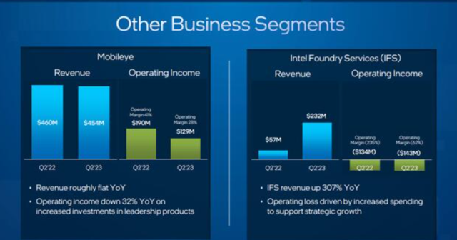 MobilEye业务营收基本持平,对旗舰产品的投资增加令经营利润收窄;英特尔Foundry服务业务营收大增,但为了占据市场份额,该业务持续维持亏损