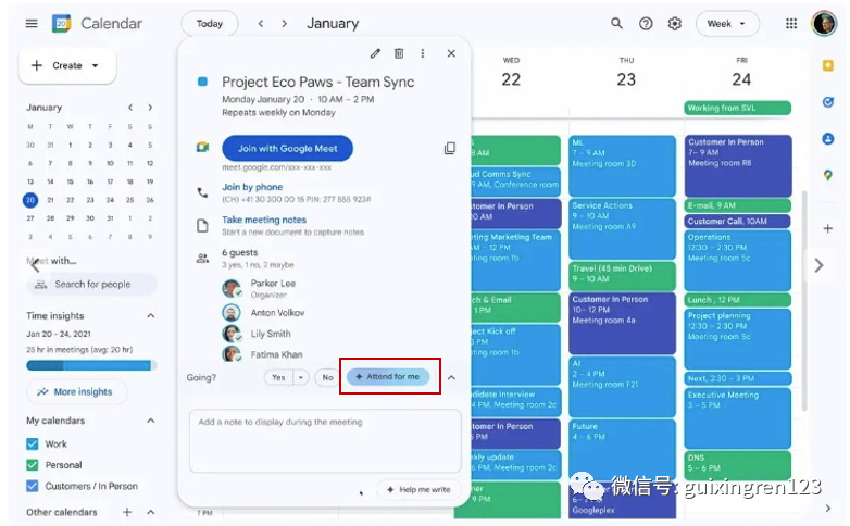 如果你有事不能参加会议,在日历会议安排中,除了说“No”之外,你还有了一个“AI替我参会”的新选项。你可以把你想要在会议中表达或者想要了解问题告诉Duet AI,AI助手则会在会议期间向参会者传递这些信息,并将得到的反馈和答案记录下来方便你查阅。