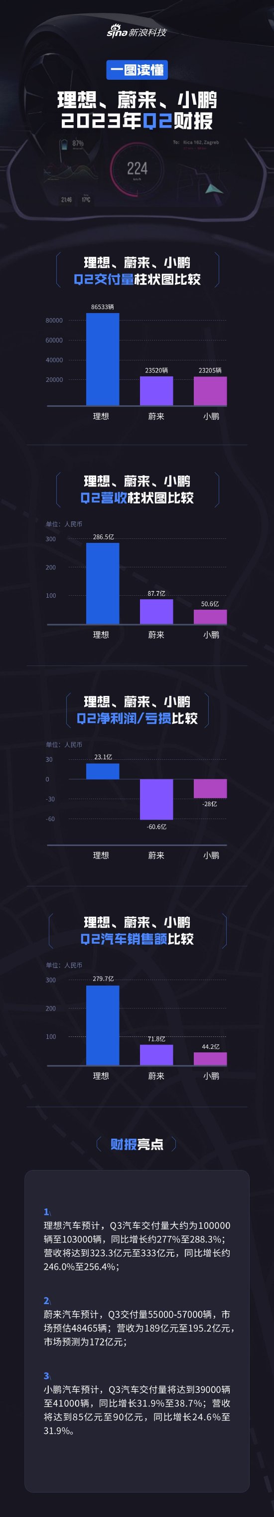 二季度,理想汽车交付量86533辆,营收286.5亿元,汽车销售额279.7亿元,净利润23.1亿元;蔚来交付量23520辆,营收87.7亿元,汽车销售额71.8亿元,净亏损60.6亿元;小鹏汽车交付量23205辆,营收50.6亿元,汽车销售额44.2亿元,净亏损28亿元。