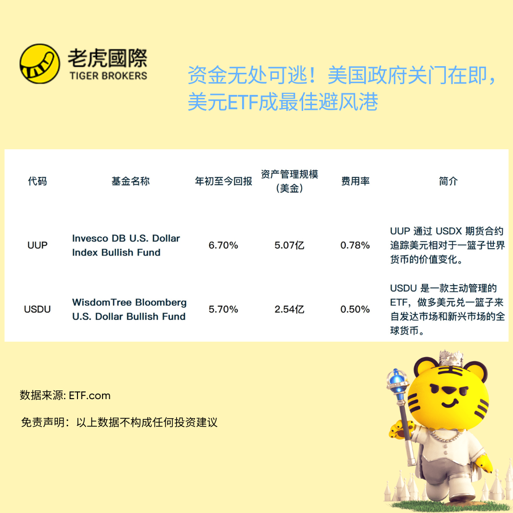 美国政府关门似乎已经板上钉钉。面对即将到来的政府关门,市场预计美国财政部可能会大幅发行美债,美国国债价格正在暴跌,并拖累其他债券市场,债券的避险功能似乎已经丧失。 由于美联储决心在更长时间内维持较高利率,投资者发现,美元ETF成最佳避风港。