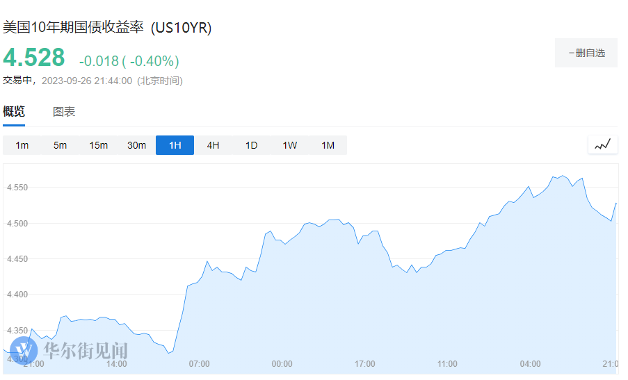 自美联储上周“放鹰”,暗示利率可能保持在高位以来,美债价格大跌,收益率持续上升。隔夜美国10年期国债收益率收盘价正式突破4.5%,为2007年以来首次,目前徘徊在4.528%左右。