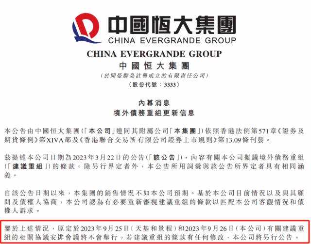 此前,9月22日深夜,中国恒大发布公告称,自3月22日提议境外债务重组的公告发布以来,集团的销售情况不如公司预期,基于公司目前情况以及与其顾问及债权人协商,公司认为有必要重新审视建议重组的条款以匹配本公司客观情况和债权人诉求。