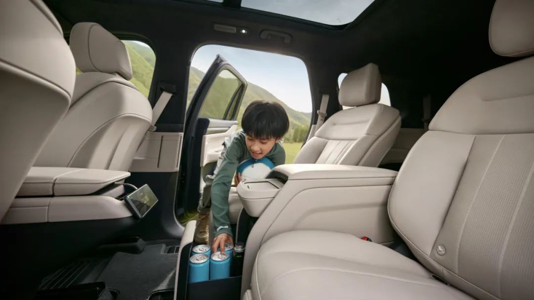 下层则是标配智能车载冰箱,采用全铝合金箱体设计,深灰色磨砂箱体,打造“恒温酒柜般”的高级感,有里有面。优秀的导冷导热性,加上近5L的容量,8听冷/热饮品的摆放不在话下。同时还可支持手机远程控制及丰富的预约功能。