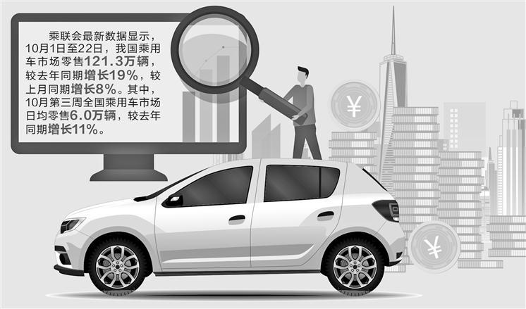 乘联会10月25日披露的最新数据显示,10月1日至22日,我国乘用车市场零售121.3万辆,较去年同期增长19%,较上月同期增长8%。其中,10月第三周全国乘用车市场日均零售6.0万辆,较去年同期增长11%。