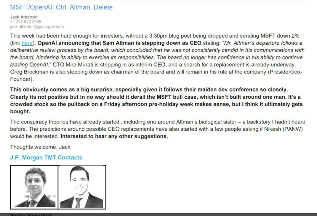 摩根士丹利分析师Jack Arherton给本周的总结起名为《微软/OpenAI:一键删除Altman》,文章称,Altman被“扫地出门”,对微软而言很明显不是一个积极的信号,但它绝不应该破坏微软看涨的前景,微软的前景并不是围绕这一个人存在的,周五下午的回调是合理的,但我认为它最终还是会上涨。