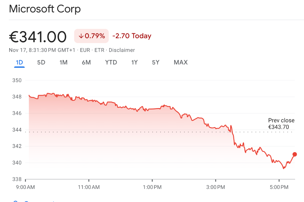 首先最显而易见的影响是对微软股价,受OpenAI高层大地震的影响,微软美股尾盘一度跳水,跌幅扩大至超过2%,刷新日低,最终收跌近1.7%。