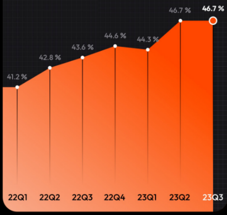 相较同业,涂鸦的回暖迹象出现得更早、持续性也更强。公司整体营收在22年Q3至今年Q3的每个季度都实现了环比增长,验证了公司具有较强的反弹趋势——公司总营收同比增长为35.7%,整体毛利率增至46.7%,持平历史最高;非公认会计准则(non-GAAP)净利润约1,010万美元,环比增长率567%,同比大幅扭亏为盈!