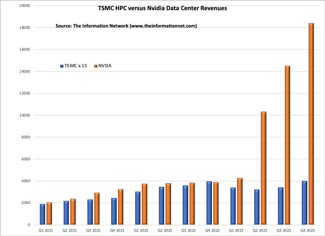 为了进行准确的比较,在图2中,我绘制了2021年第一季度至2023年第四季度台积电的高性能计算(HPC)收入与英伟达的数据中心收入。为了确保视觉兼容性,我将台积电的HPC收入(新台币十亿元)扩大了15倍,而英伟达的收入以百万美元为单位。