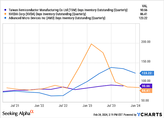 图9显示了台积电(包括客户英伟达和AMD)过去3年的库存天数。由于芯片需求疲软,英伟达和AMD的库存天数在2023年上半年有所增加,随后AMD的库存天数降至123天,英伟达的库存天数降至86天。台积电库存在此期间保持持平。