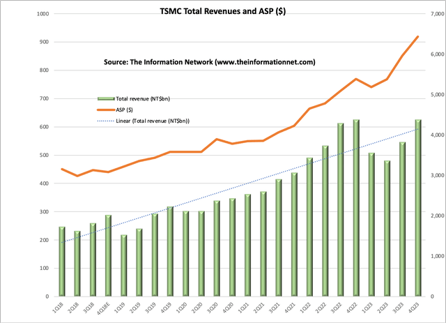 台积电原计划在2023年中期提高芯片价格,但芯片市场及其收入的放缓迫使该公司放弃了这一计划。图6显示了台积电2018年第一季度至2023年第四季度的收入和平均售价。