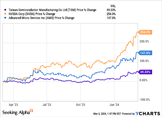 图8显示了台积电、英伟达和AMD过去一年的股价变化表现。它显示了英伟达与其他公司相比的不成比例的增长。