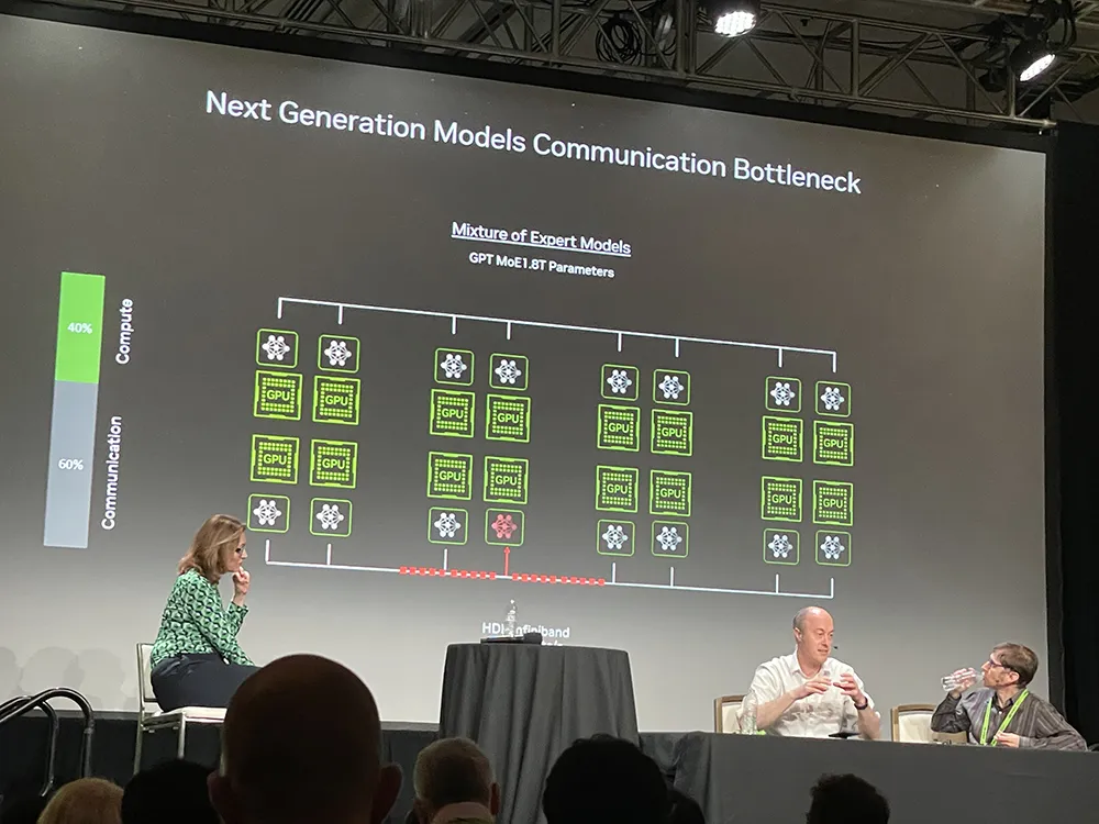 省钱与省电成正比,提高能效的关键是减少通信损耗。据Ian Buck和Jonah Alben分享,在GPU集群上运行庞大的GPT-MoE模型,有60%的时间都花在通信上。