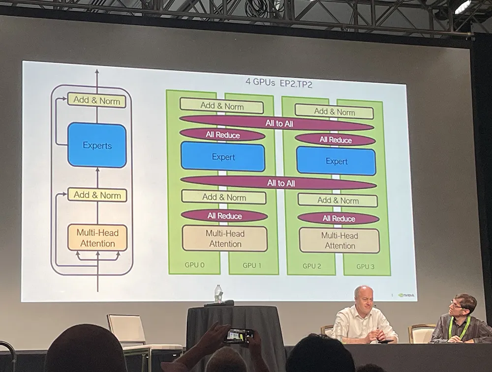 Ian Buck解释说,这不光是计算问题,还是I/O问题,混合专家模型带来更多并行层和通信层。它将模型分解成一群擅长不同任务的专家,谁擅长什么,就将相应训练和推理任务分配给谁。