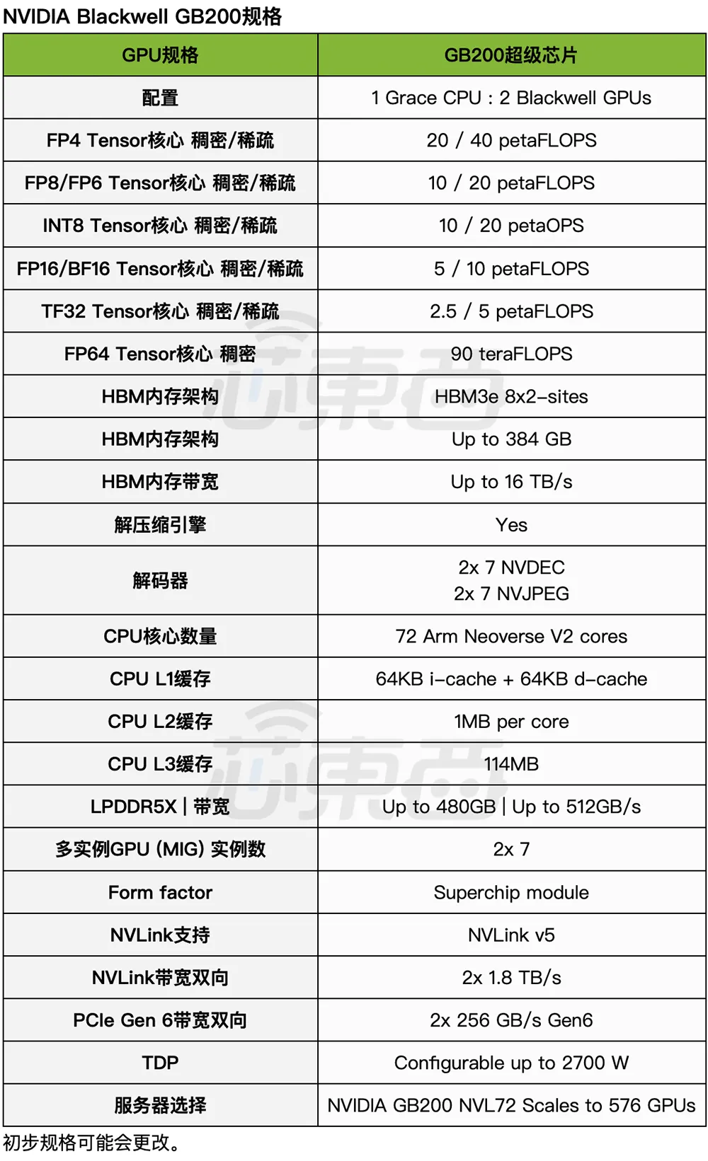 ▲Blackwell GB200规格(图源:芯东西根据技术简报表格译成中文)