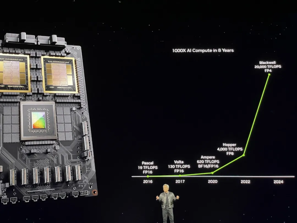 从2016年Pascal GPU的19TFLOPS,到今年Blackwell GPU的20PFLOPS,黄仁勋宣布英伟达用8年将单卡AI训练性能提升了1000倍。