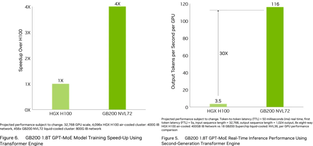 ▲基于第二代Transformer引擎的GB200 1.8T GPT-MoE实时推理性能