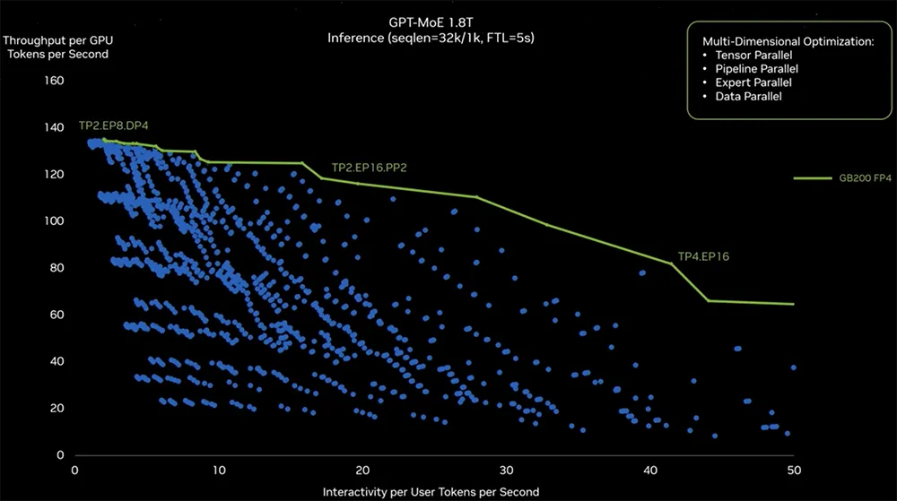 为了找出GPT-MoE训练的正确并行配置,英伟达做了大量实验(得到图中的蓝点),以探索创建硬件和切割模型的正确方法,使其尽可能实现高效运行。其探索包括一些软件重分块、优化策略判断,并将大模型分布在不同的GPU中来满足性能需求。