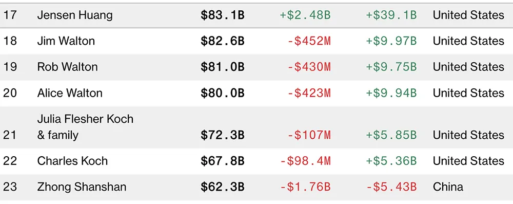 ▲在最新彭博亿万富豪榜中,黄仁勋是第17名 ,钟睒睒是第23名