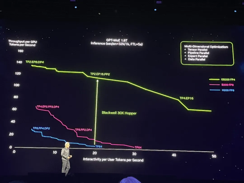 但如果从系统性能来看,相比上一代Hopper集群,Blackwell可将1.8万亿参数的GPT-MoE推理性能提高到30倍。