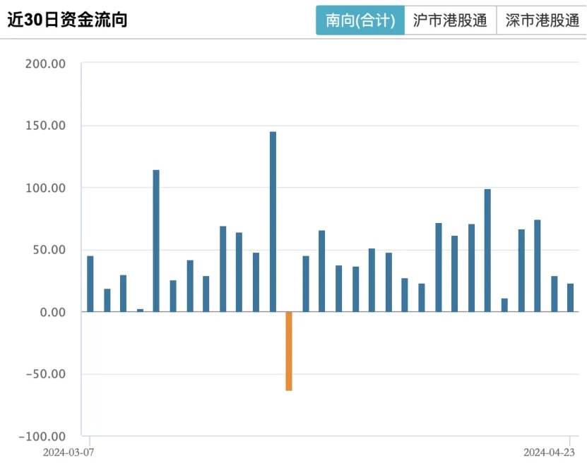 近两日,港股市场集体狂飙。据Wind数据显示,4月23日,南向资金成交370.63亿港元,净流入23.40亿港元。这已是南向资金连续17个交易日录得净买入,合计达842亿港元,年内累计净买入金额增至2024.5亿港元。