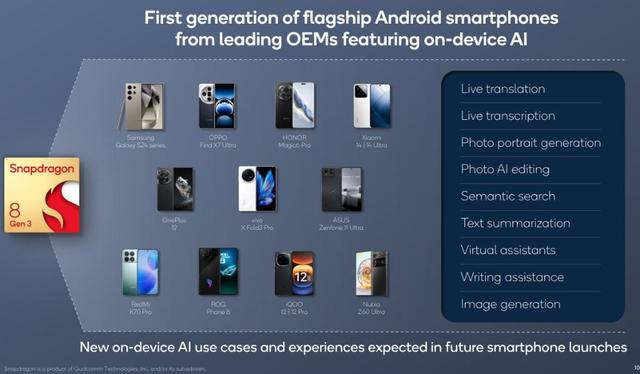 高通还称,需要最先进芯片的“高端”或“人工智能驱动”的智能手机对其产品有着强劲需求。一些领先OEM厂商推出了第一代搭载端侧AI功能的旗舰安卓智能手机,其中不乏中国厂商: