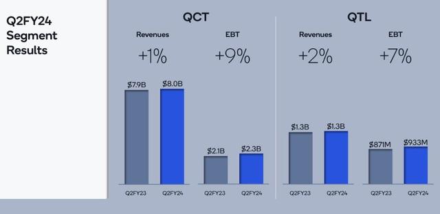 此外,利润颇丰的许可业务QTL营收同比增长2%至13.2亿美元,高于预期的13.1亿美元,扭转了去年四季度同比下滑4%至14.60亿美元的颓势。这部分业务的税前利润率高达71%,主要是向希望将高通的5G或蜂窝技术集成到其产品中的公司收取费用。