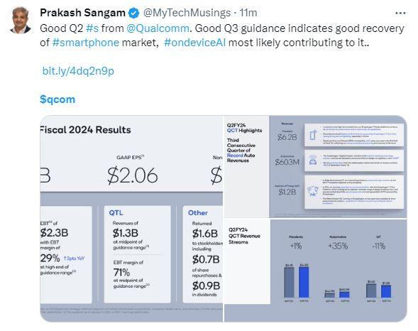 公司总裁兼CEO安蒙(Cristiano Amon)表示,连续第三个季度实现了创新高的汽车芯片收入,还即将推出骁龙Snapdragon X 平台,并在多个产品类别中实现领先的端侧人工智能功能。