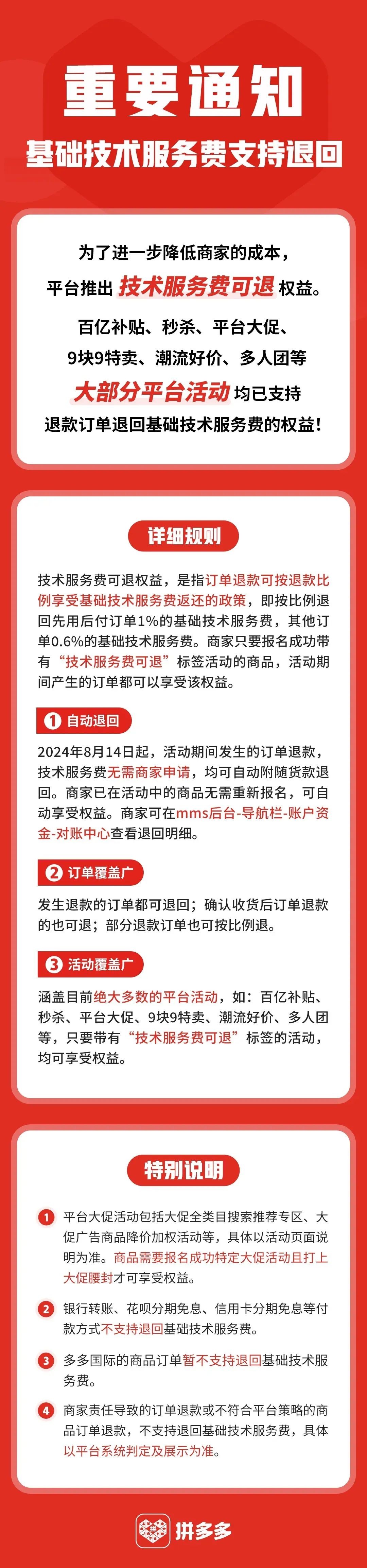 此外,自2024年8月14日起,活动期间发生的订单退款,技术服务费将无需商家申请,自动随货款退回,极大地简化了退款流程。