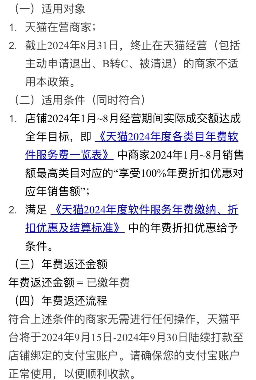 7月底,淘宝天猫宣布取消年度软件服务年费,自2024年9月1日起实施。新入驻商家将无需再支付这笔费用,而达成全年经营目标的商家则可享受年费提前返还的优惠,其余商家也将获得部分年费的返还。