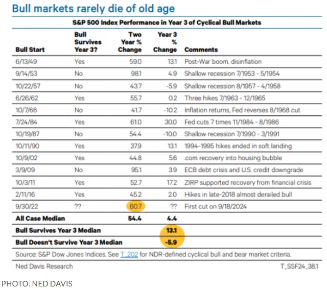 但未来走势则更加难以预测。根据Ned Davis团队的分析,牛市在第三年通常获得13.3%的中位数涨幅,但未能延续的牛市则出现了5.9%的回撤。