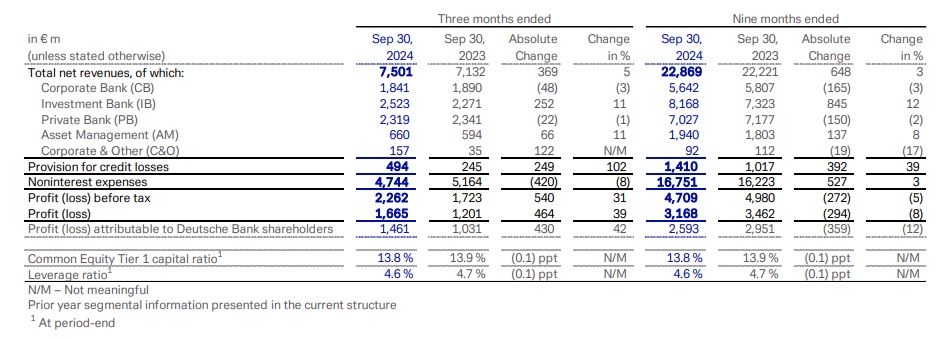 10月23日,德意志银行公布了2024年第三季度财务业绩。财报显示,德银第三季度净营收为75.01亿欧元,同比增长5%,好于分析师平均预期的73.38亿欧元;归属于公司股东的净利润为14.61亿欧元,同比增长42%。
