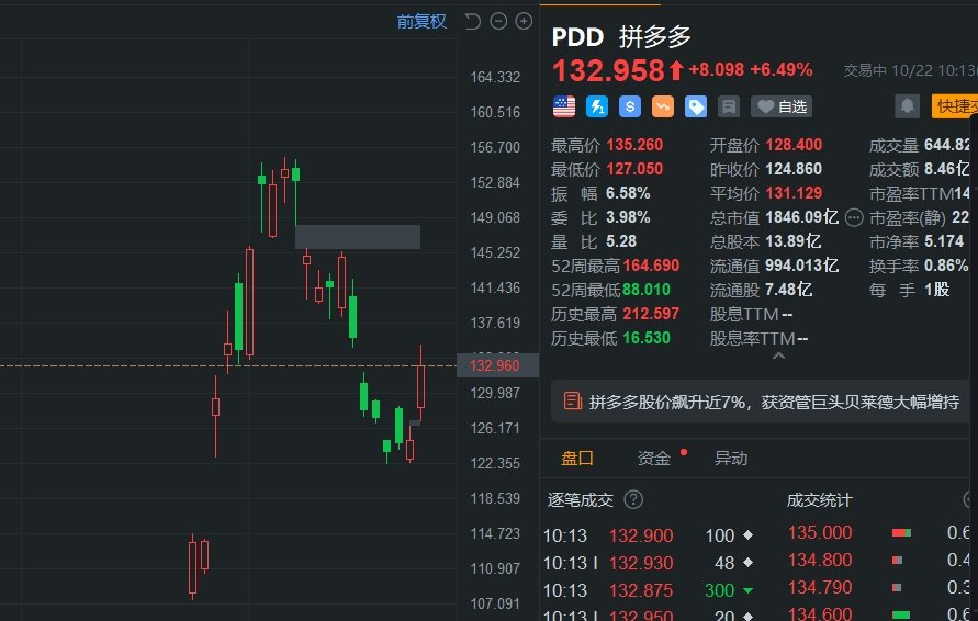 格隆汇10月22日|拼多多(PDD.US)美股涨幅一度扩大至8%。披露文件显示,今年二季度,贝莱德持有拼多多约2900万股,相当于总股本的2.1%。根据SEC于10月21日披露的文件,贝莱德持股大幅增加至约1.32亿股,相当于总股本的9.5%。(格隆汇) 海量资讯、精准解读,尽在新浪财经APP