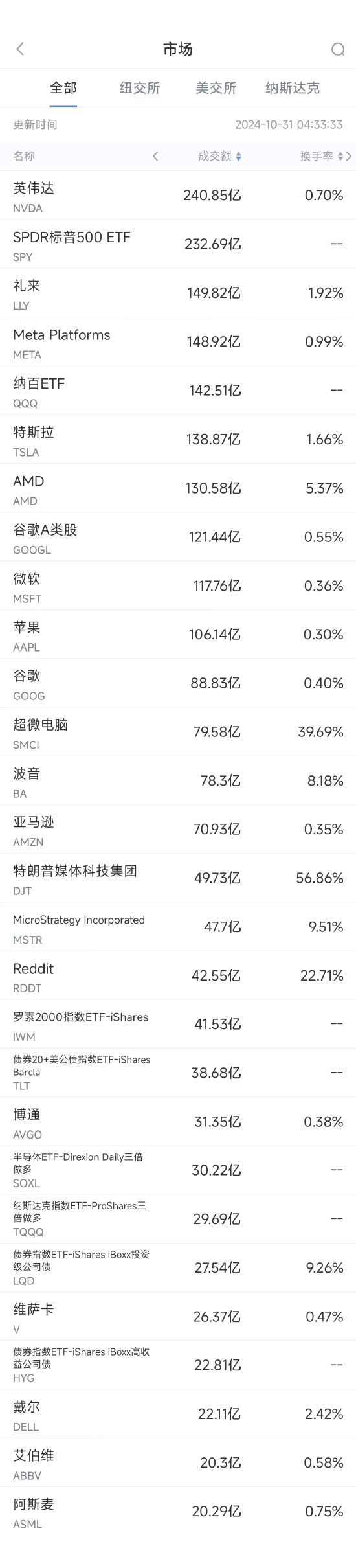 第2名礼来制药收跌6.28%,成交149.82亿美元。礼来制药发布2024年第三季度财报,前三季度营业收入315亿美元,同比增长27%,净利润61.8亿美元。第三财季营收114.4亿美元,同比增长20.5%。