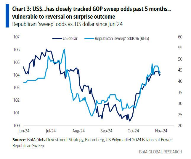在最新发布的《Flow Show》报告中,Hartnett写道,过去四个月美元和美债收益率持续走强,主要源于市场对特朗普胜选预期升温。然而,正是这种过于一致的市场预期,反而使得美元和美债收益率面临潜在调整风险。