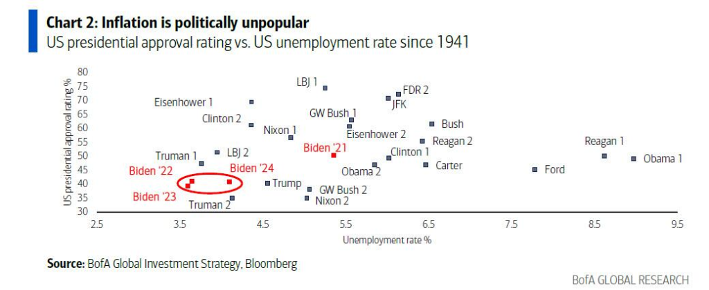 原因在于选民对通胀和生活成本上升的强烈不满,这一点已明显反映在拜登持续走低的支持率上(如下图所示,Hartnett认为,即使在失业率处于低位的情况下,拜登的支持率仍持续走低,这正反映了通胀对选情的巨大杀伤力。)
