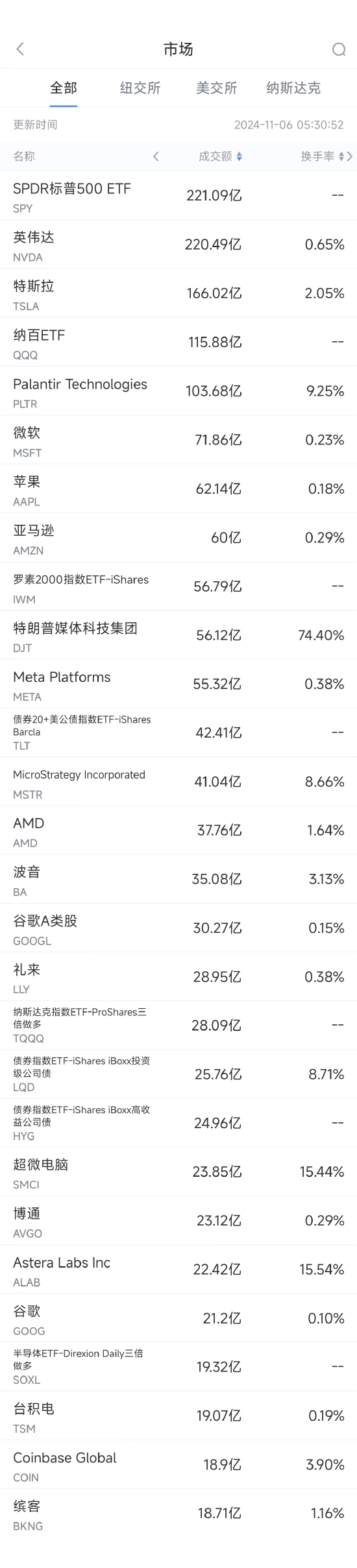 第7名特朗普媒体科技集团收跌1.16%,成交56.12亿美元。该股周二高开低走,盘中一度上涨超过17%,但尾盘急跌并数次触发熔断。