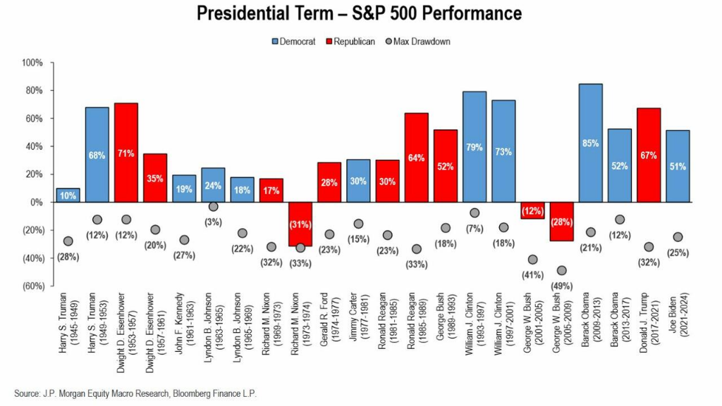 这张图展示了美国总统任期内标普500指数的表现。从图中可以看出,无论是民主党还是共和党执政期间,标普500指数都呈现出长期上涨的趋势。