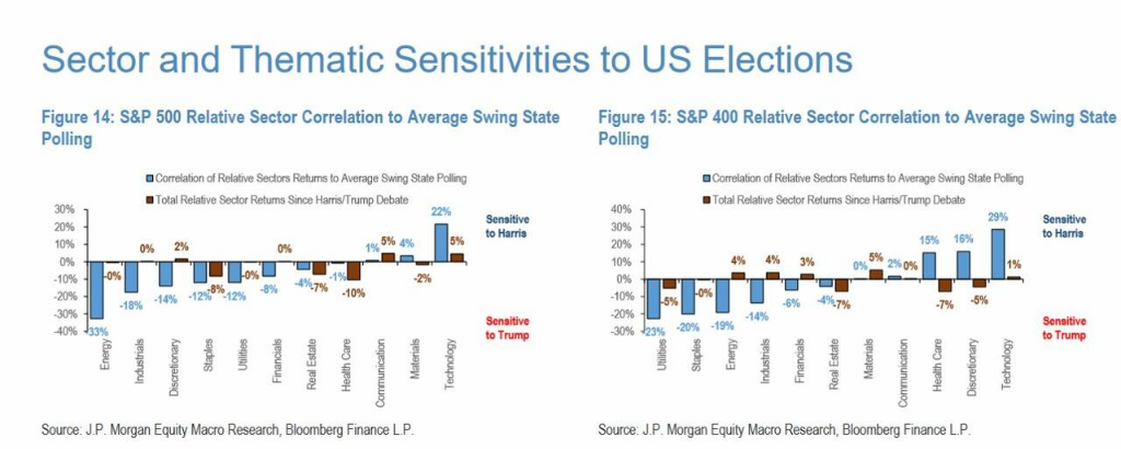 摩根大通预计,红色横扫将在能源、银行、工业和运输等关键行业引入积极的政策、减税和放松管制,而蓝色横扫可能不太有利于股市,预计民主党人将优先考虑针对绿色能源、医疗保健改革和可能增加企业税的财政措施。