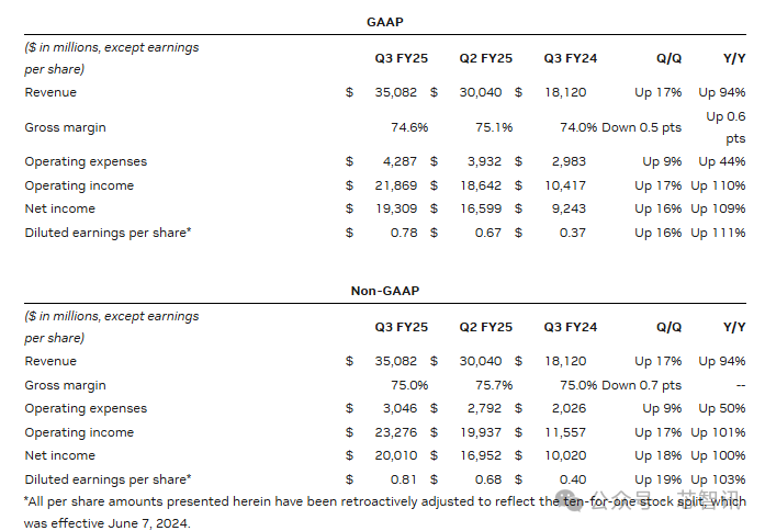 英伟达第三季营收达351亿美元,同比暴涨94%,环比增长17%,且优于市场预期的331.6亿美元。