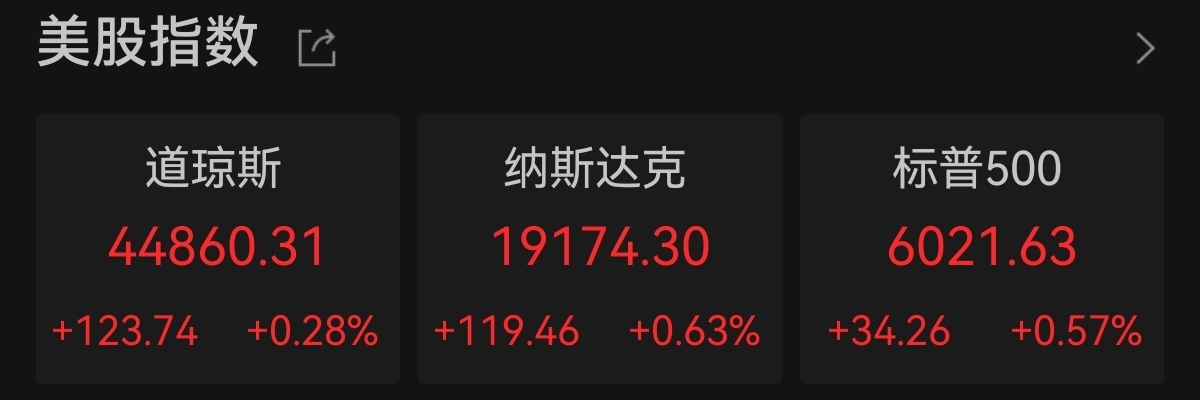 中新经纬11月27日电 美东时间周二,美股三大指数集体收涨,道指、标普500指数均创盘中与收盘历史新高。截至收盘,道指涨123.74点,涨幅为0.28%,报44860.31点;纳指涨119.46点,涨幅为0.63%,报19174.30点;标普500指数涨34.26点,涨幅为0.57%,报6021.63点。