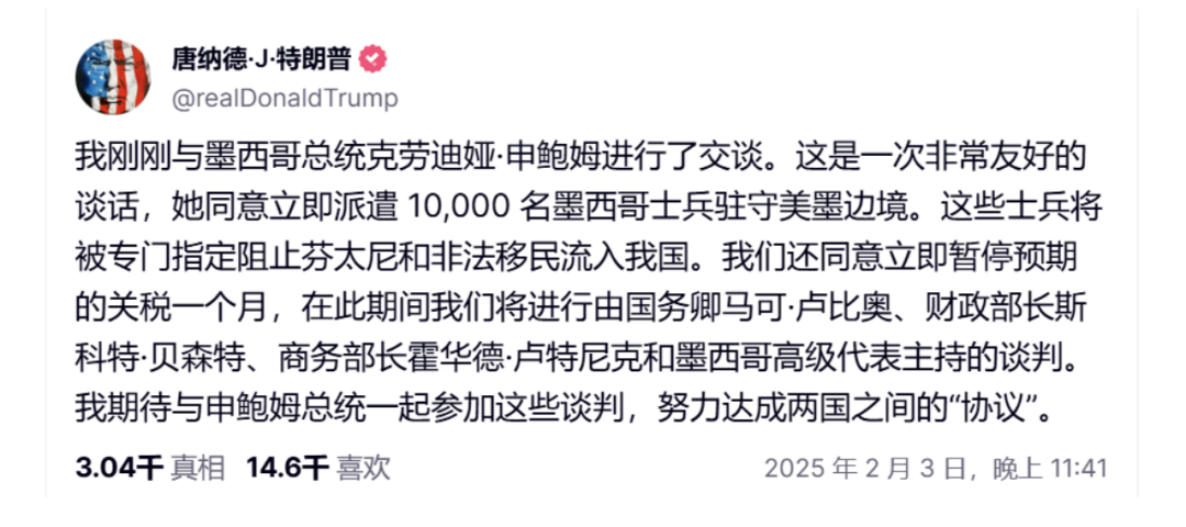 不久之后,特朗普也发文称,这是一次非常友好的谈话,已经与墨西哥总统达成一致,决定立即暂停预期的关税一个月。