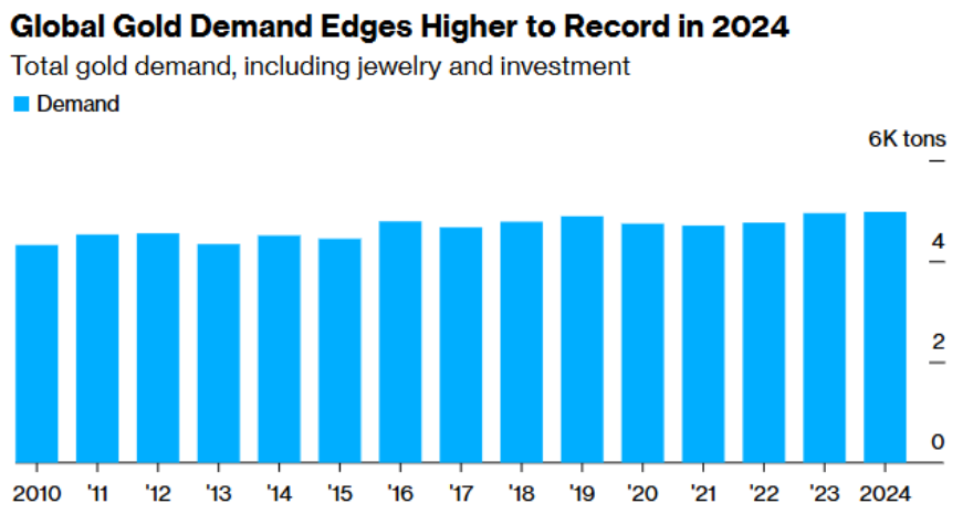 根据世界黄金协会(World Gold Council)的最新报告,2024年“全球各大央行以惊人的速度继续大量购买黄金”,并且第四季度购买量大幅加速。去年全球黄金总需求达到创纪录的4,974吨。