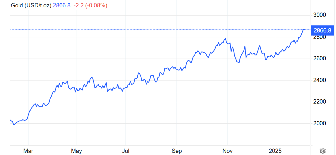 今年以来,黄金价格上涨约8%,而2024年全年涨幅超过27%,甚至超过了标普500指数高达24%的强劲涨幅。
