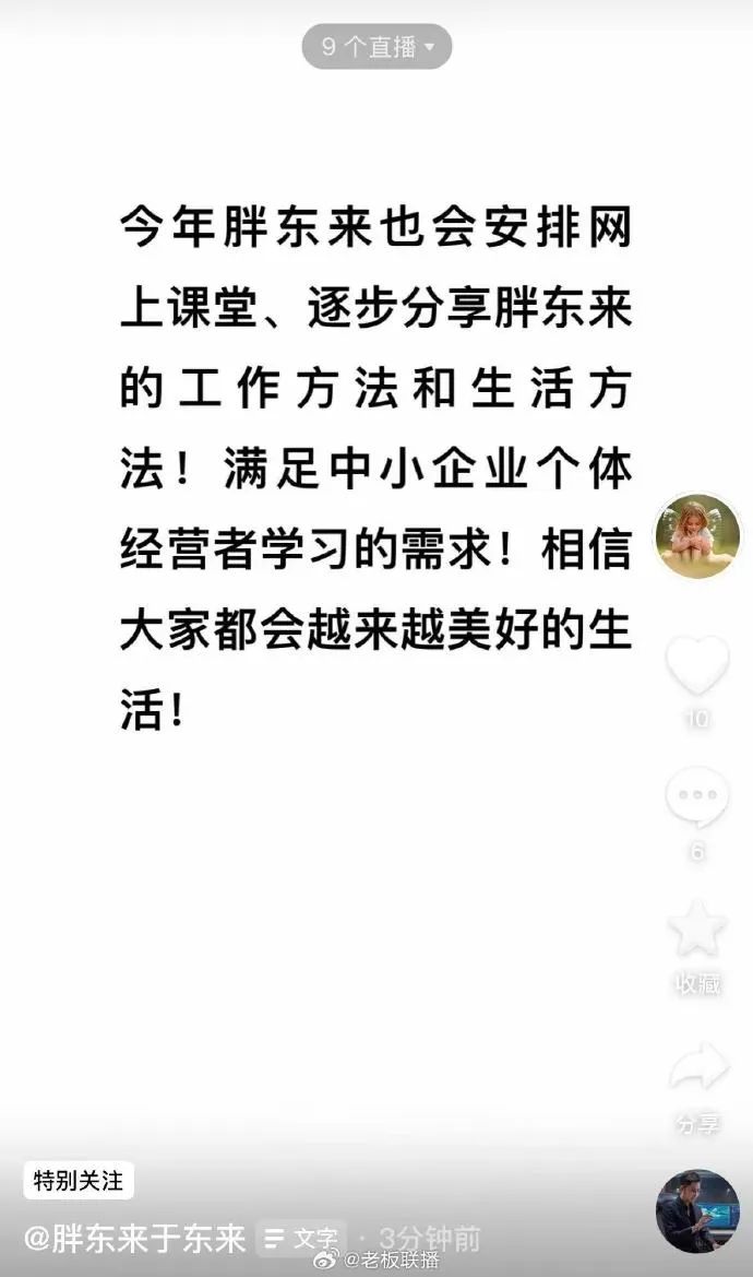 【胖东来今年将安排网上课堂】2月11月,胖东来创始人于东来发文:今年胖东来也会安排网上课堂、逐步分享胖东来的工作方法和生活方法!满足中小企业个体经营者学习的需求!相信大家都会越来越美好的生活!(每经网)