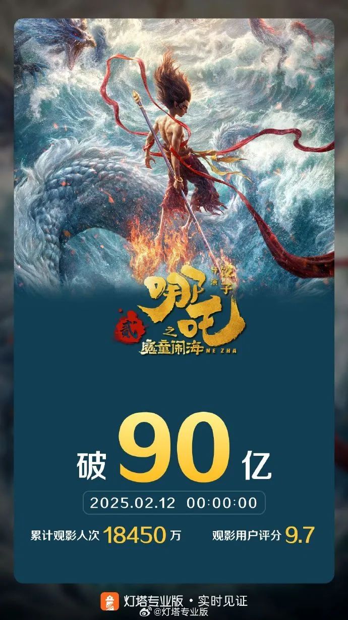 【《哪咤之魔童闹海》票房破90亿】据灯塔专业版实时数据,截至2月12日0时0分,影片《哪咤之魔童闹海》票房突破90亿元。(界面新闻)