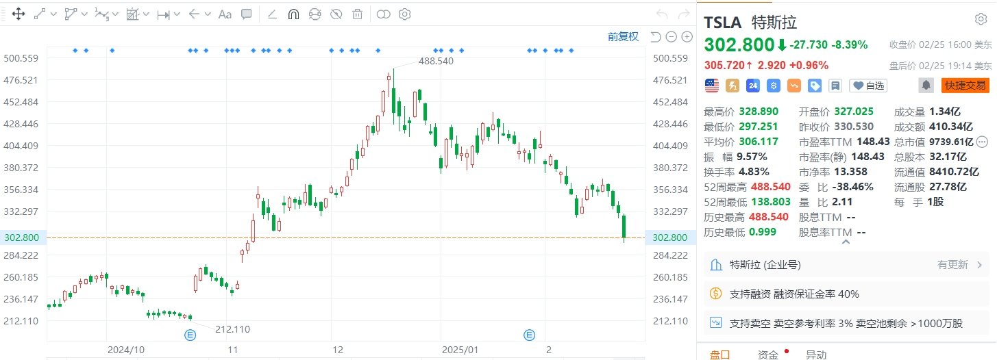 格隆汇2月26日|特斯拉(TSLA.US)跌8.39%,市值跌破1万亿美元,成交409.62亿美元;去年12月18日至今,该股累跌近37%。欧洲汽车制造商协会数据显示,上个月,特斯拉汽车在欧洲的销量下滑45%,而同期整个行业的电动汽车销量却飙升37%。特斯拉目前正忙于改造其最畅销车型Model Y SUV的生产线,同时首席执行官马斯克对欧洲的政治立场也引发争议。