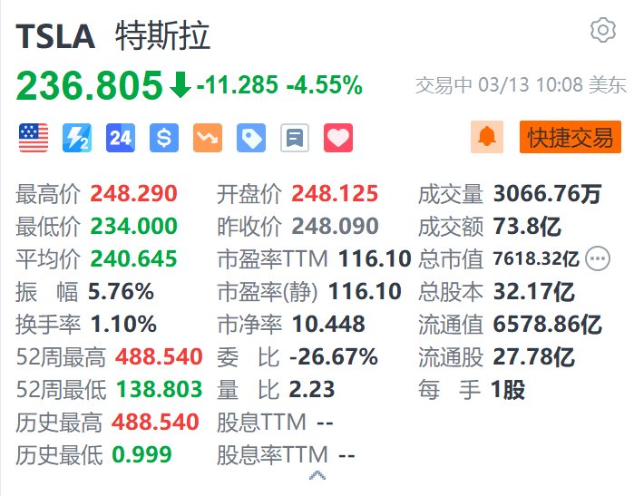 特斯拉(TSLA.US)跌超4.5%,报236.8美元。消息面上,摩根大通将特斯拉的目标价从135美元下调至120美元,并预计特斯拉今年将交付约178万辆汽车,比2024年下降约1%。特斯拉CEO马斯克的政治活动已经引发了消费者对该品牌的反感,比如在美国和世界各地的特斯拉门店举行抗议,抵制销售,以及在二手市场上丢弃已经购买的特斯拉汽车。另外,古根海姆分析师Ronald Jewsikow重申了对特斯拉的“卖出”评级,并将目标价从175美元下调至170美元。他建议投资者继续抛售该股。(格隆汇) 海量资讯、精准解读,尽在新浪财经APP