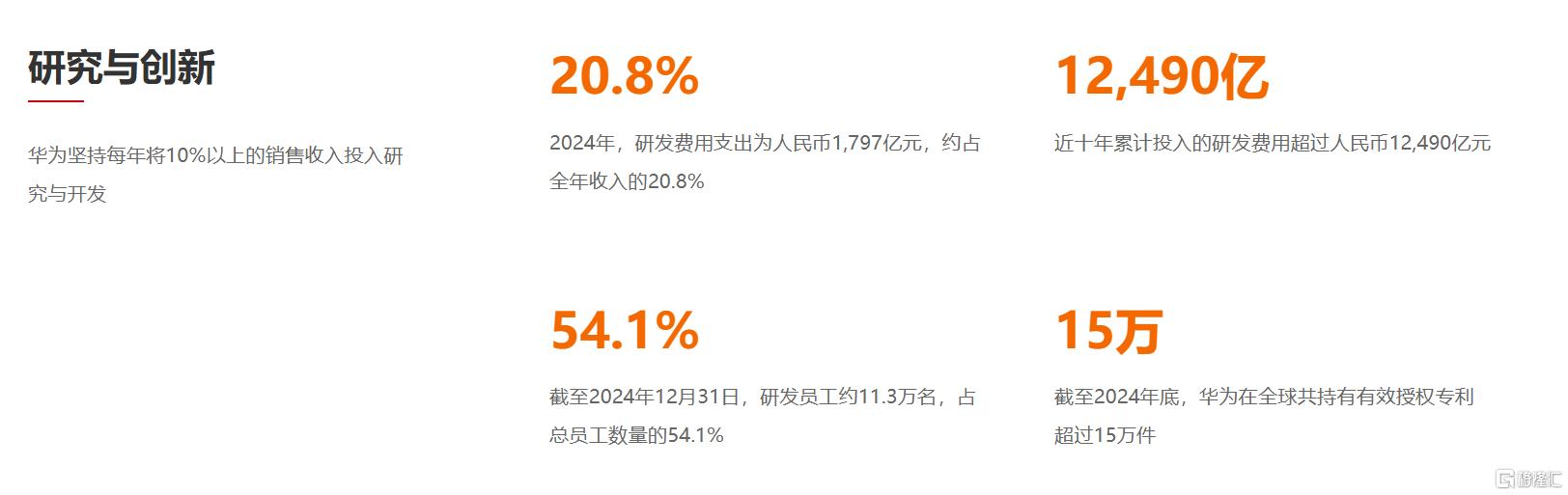 2024年,华为的研发投入达到1797亿元,约占全年收入的20.8%,近十年累计投入的研发费用超过12490亿元。